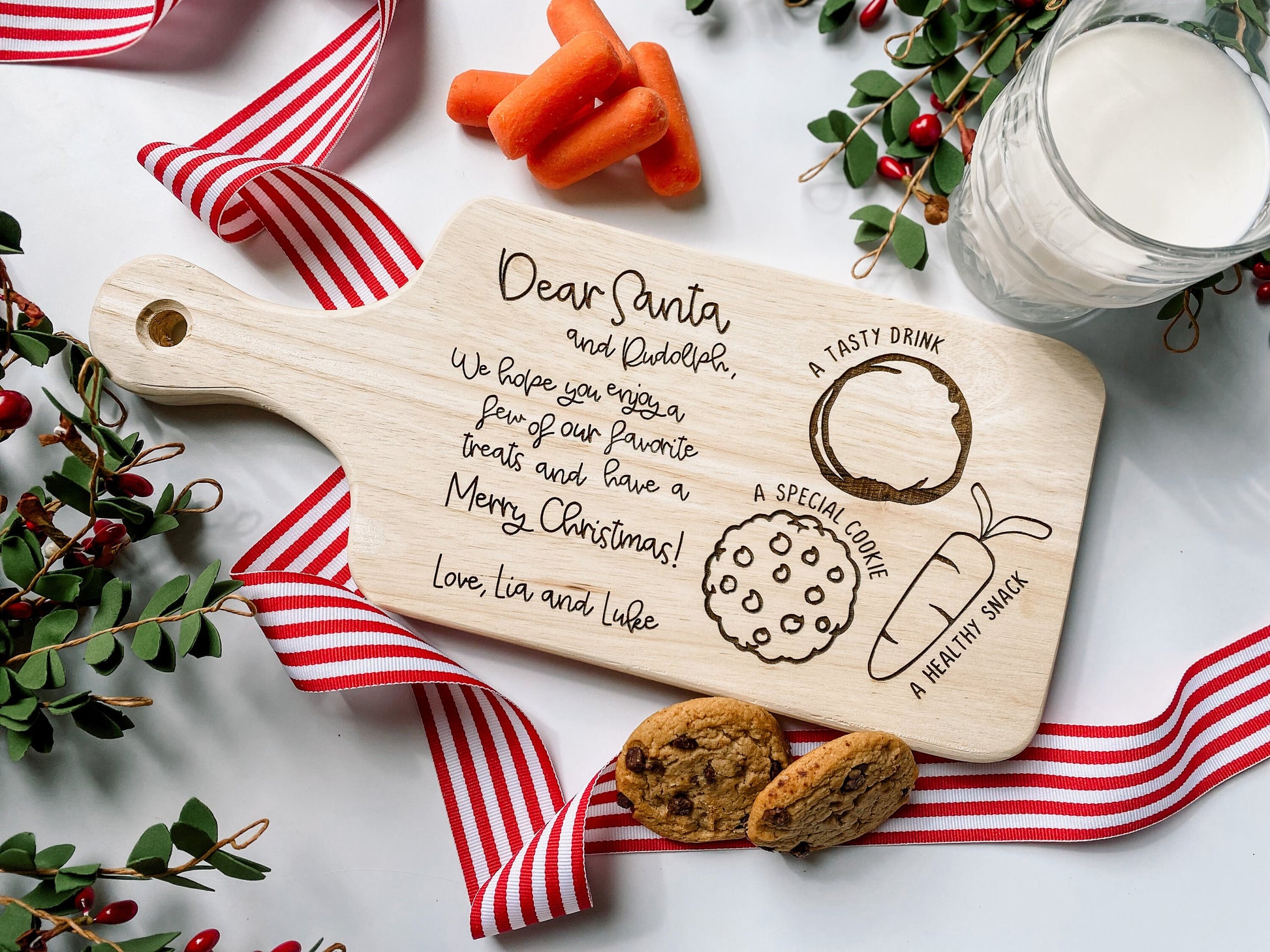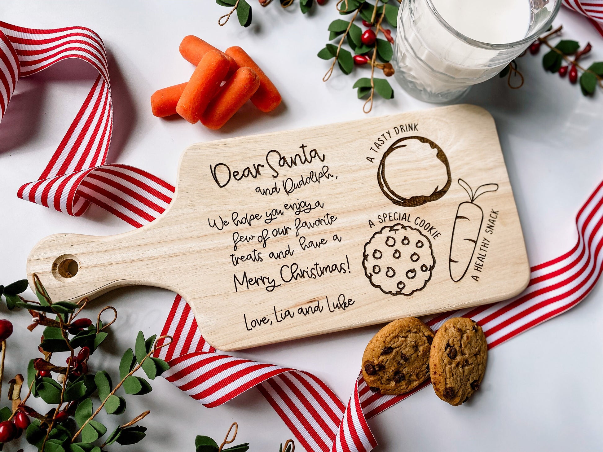 Leave milk, cookies, and reindeer treats out for Santa and his reindeer on Christmas Eve this year! This wooden board is the perfect addition to your Christmas tradition and personalized with your kiddos name(s). Our Cookies for Santa and Reindeer tray is 13” x 5.5” and is ready to ship!