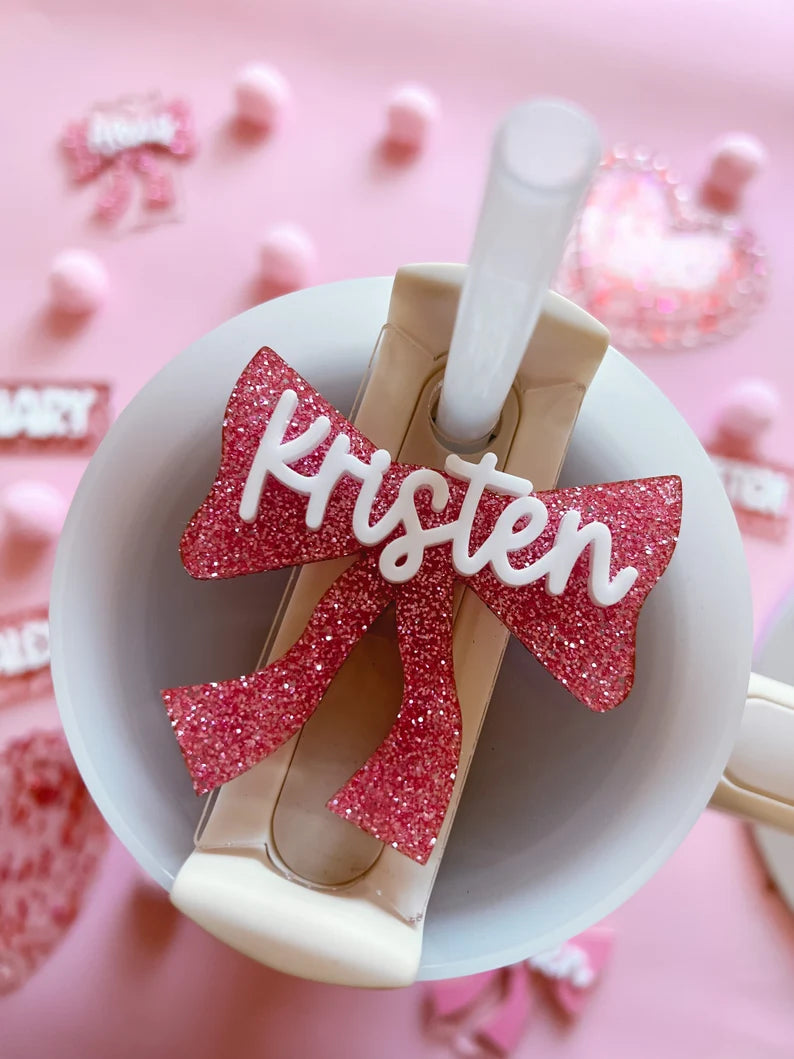 Add a little FUN to your tumbler with this acrylic bow personalized name plate! This perfect little accessory to add to your tumbler will help you differentiate from your friend's and families Stanley cups! This on-trend piece is the perfect choice for any girly! The bow is pictured in a glitter pink acrylic and each name will be in white!