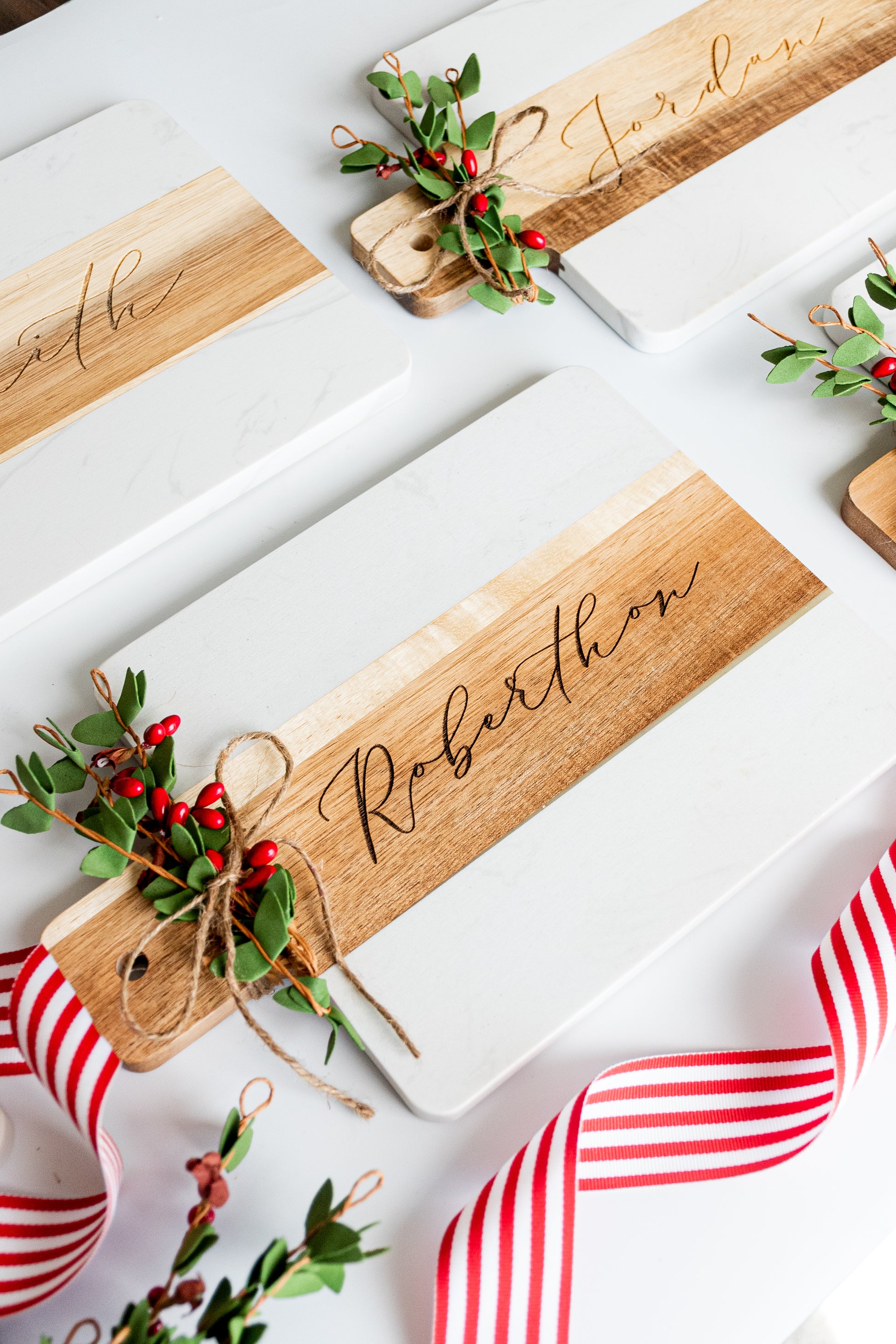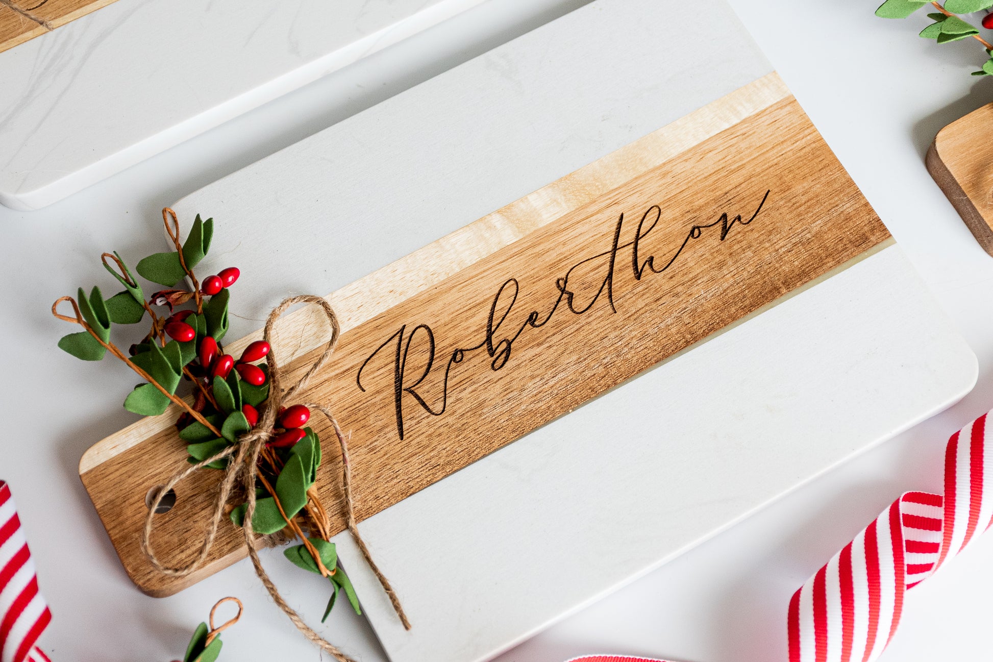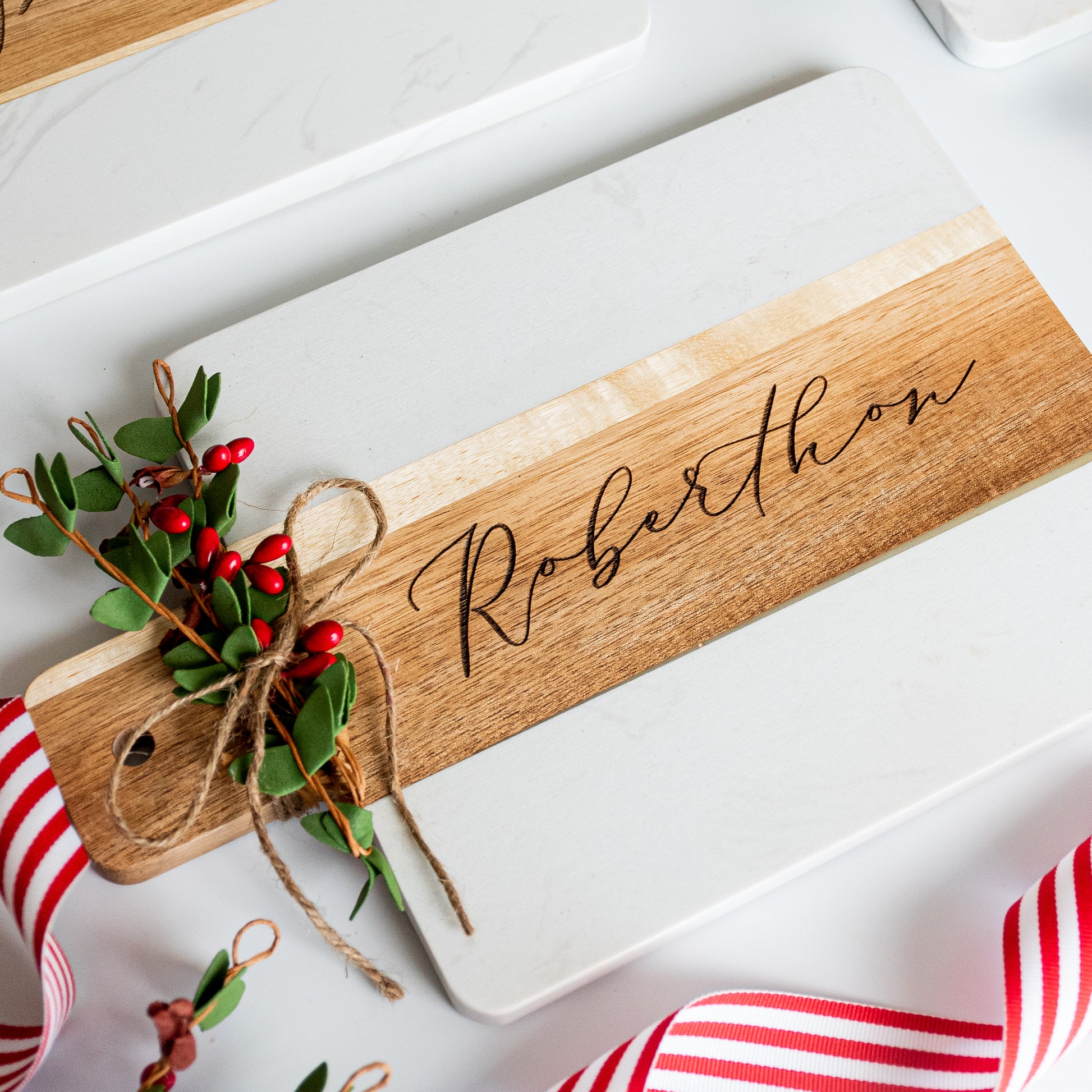 This custom engraved cutting board is perfect for any gift! Personalized with a last name, it is a gift that they will be sure to love! This board stands is 9" x 7 1/2" in size with a 2 1/2" handle. White Marble And Acacia Wood (Hand Wash Only)