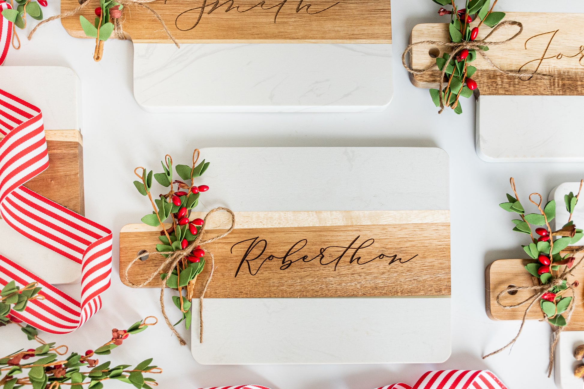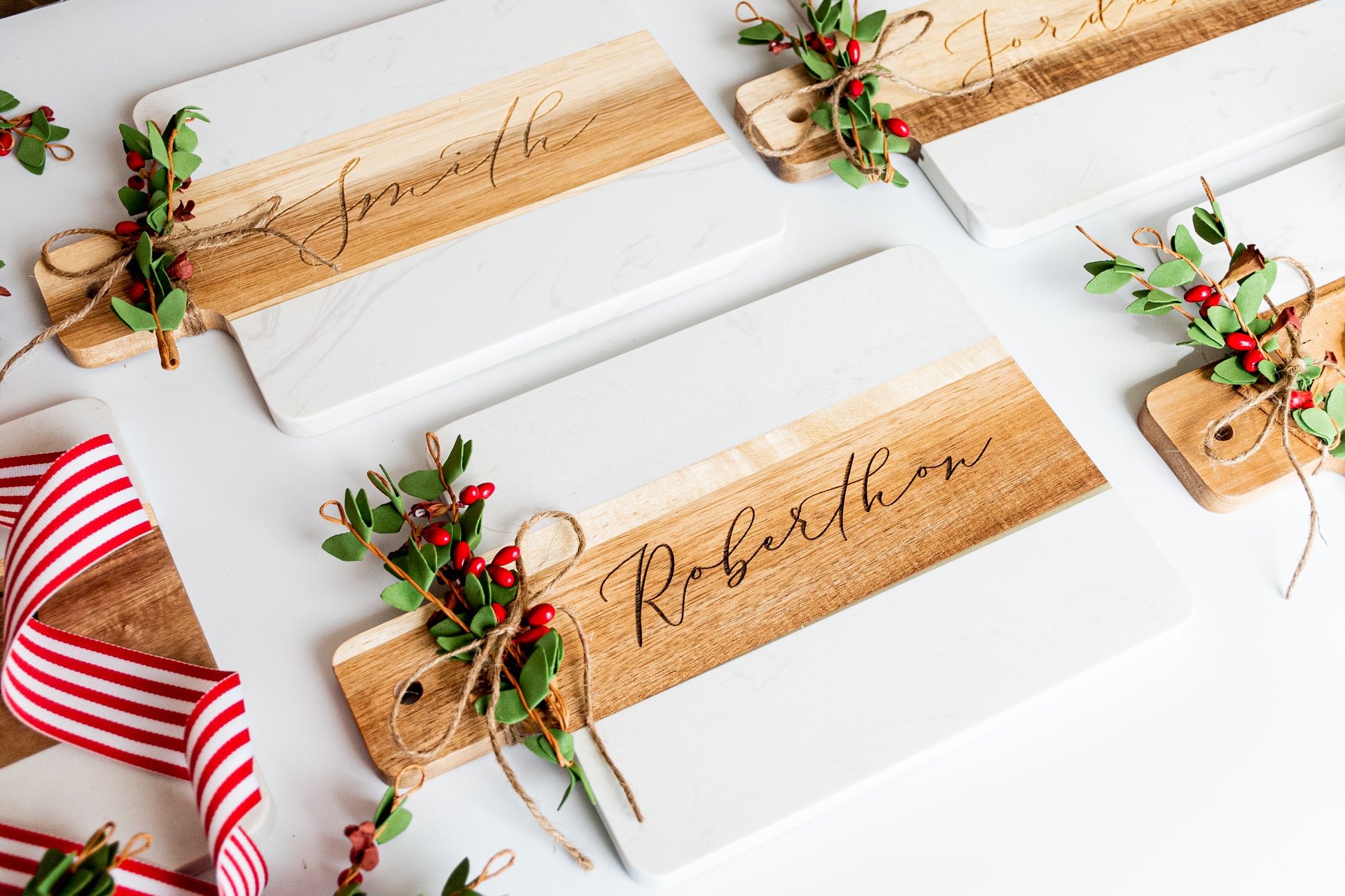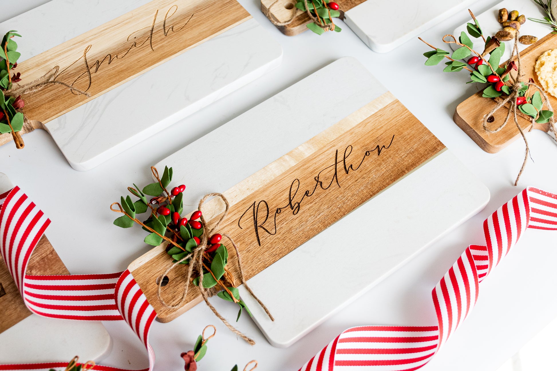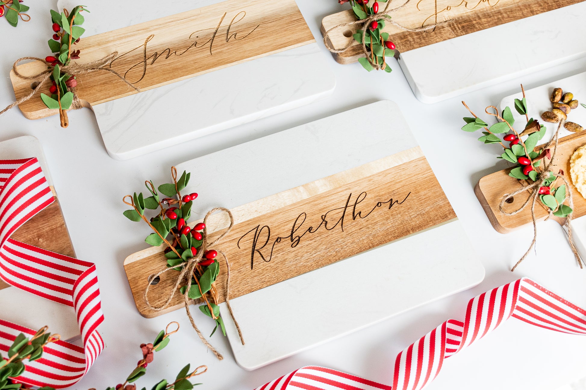 This custom engraved cutting board is perfect for any gift! Personalized with a last name, it is a gift that they will be sure to love! This board stands is 9" x 7 1/2" in size with a 2 1/2" handle. White Marble And Acacia Wood (Hand Wash Only)