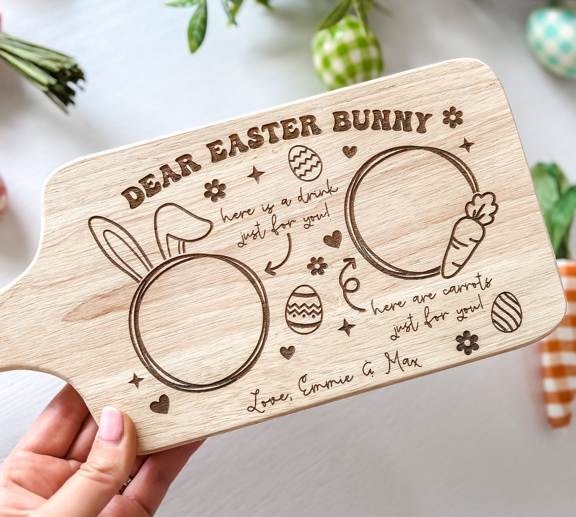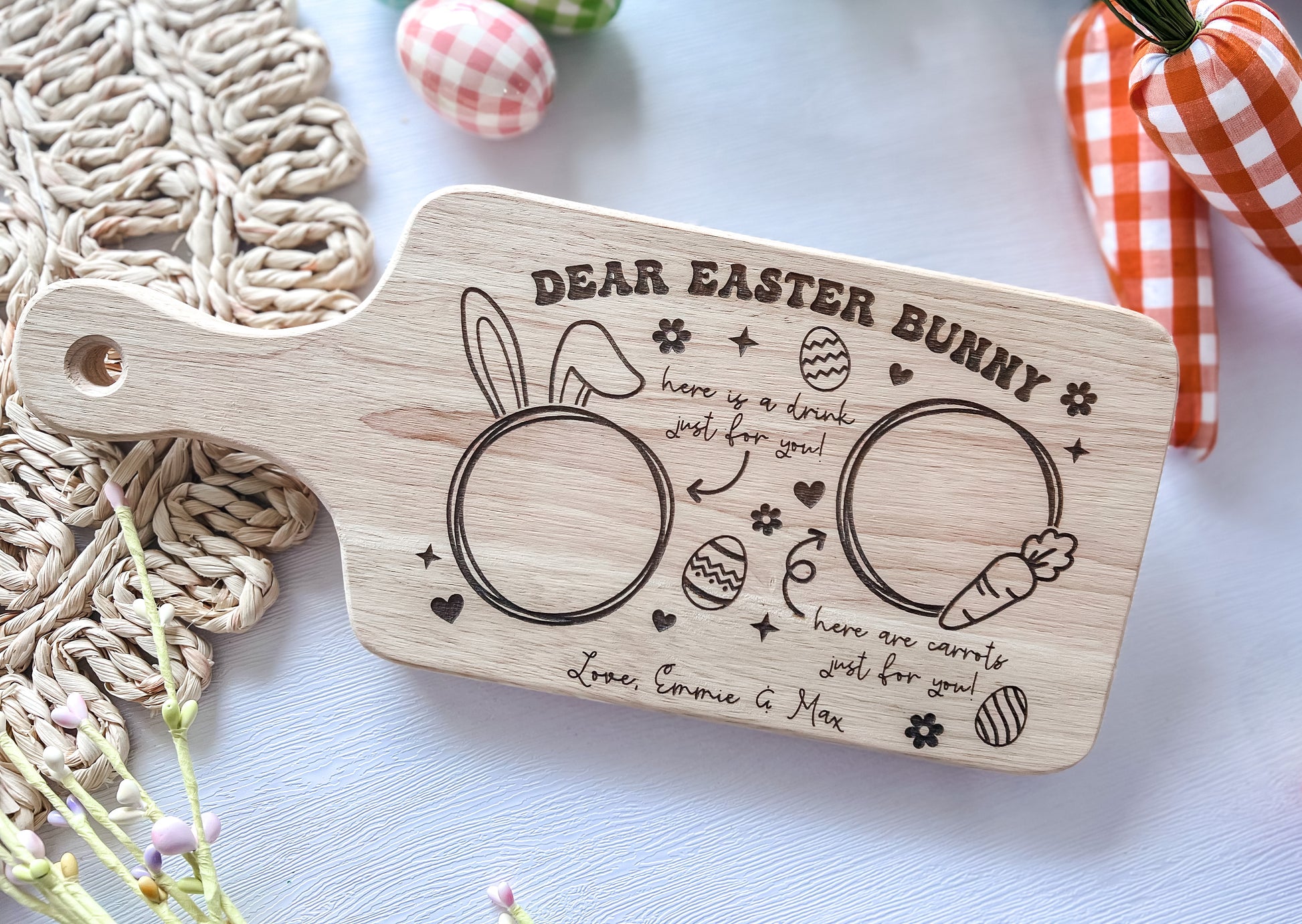 Are you ready to leave treats out for Easter Bunny this year? This wooden board is the perfect addition to your Easter tradition and personalized with your kiddos name(s). Our Dear Easter Bunny tray is 13” x 5.5” and is ready to ship! Each board is laser engraved for ultimate use for years to come.