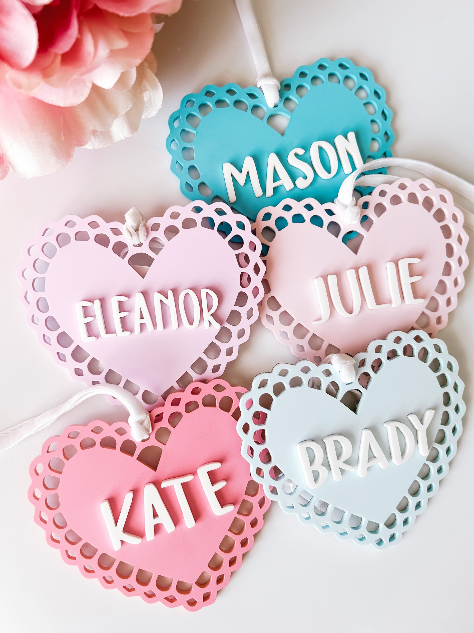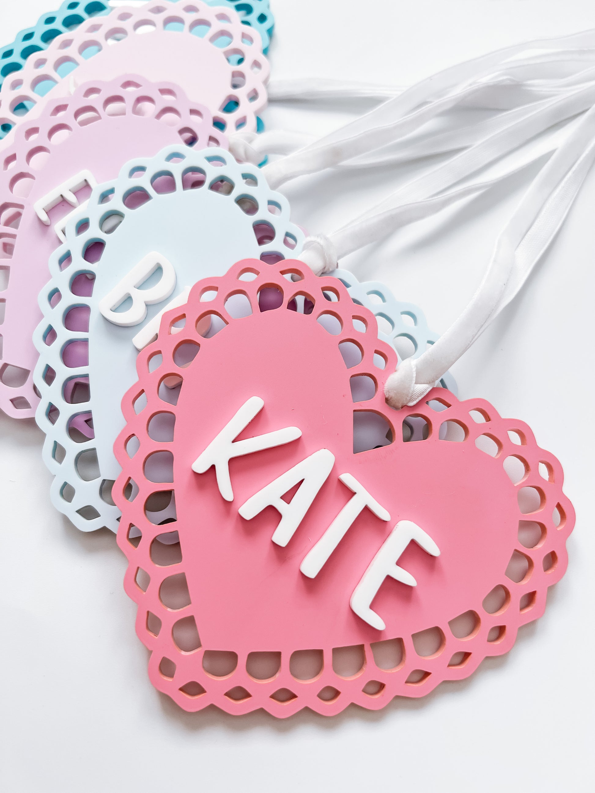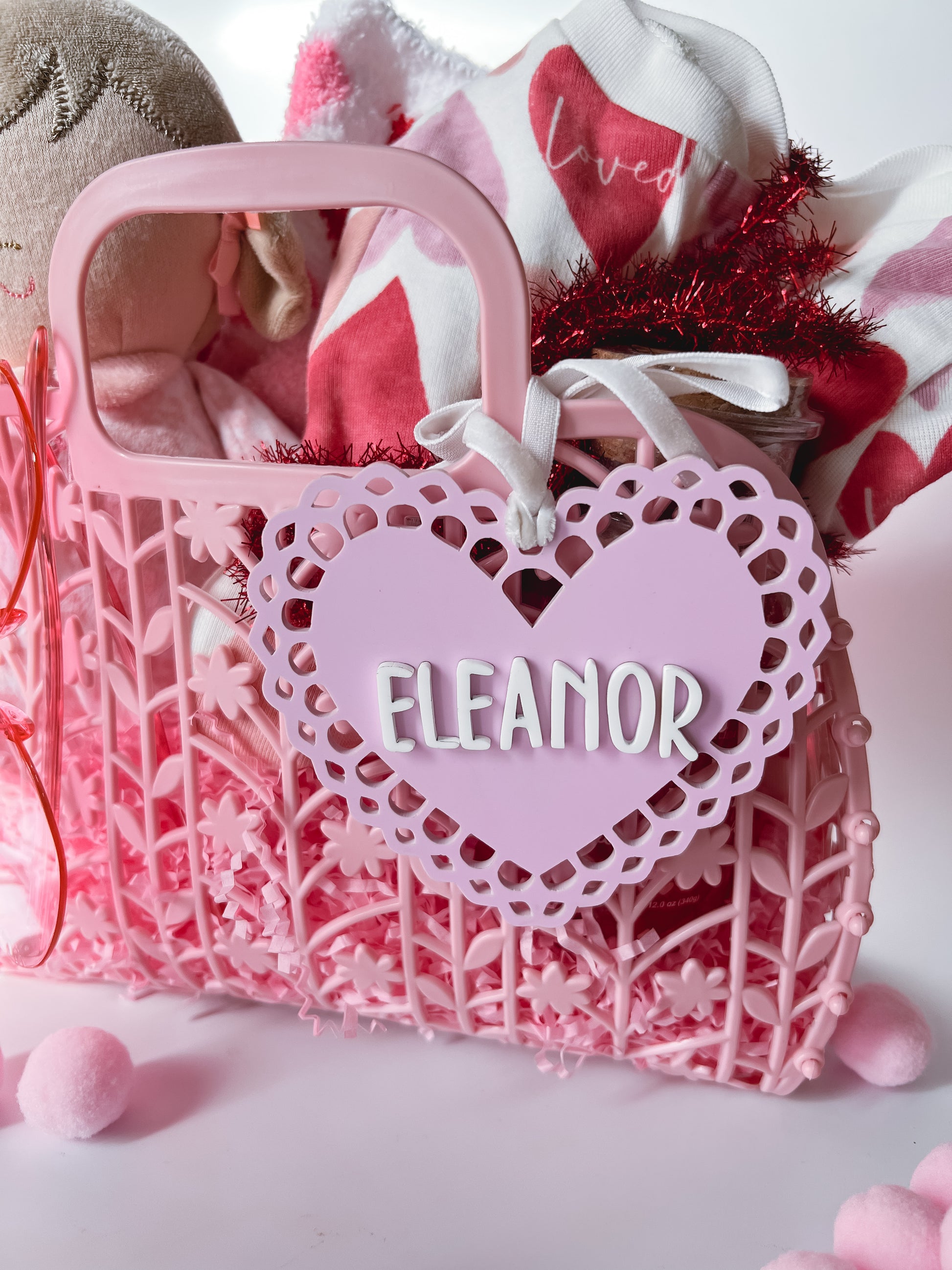 These personalized acrylic Valentine's Day tags are such a fun way to add a little personalization to any basket or gift! These acrylic tags are finished off with a white velvet ribbon so your able to attach the tag to whatever you want!