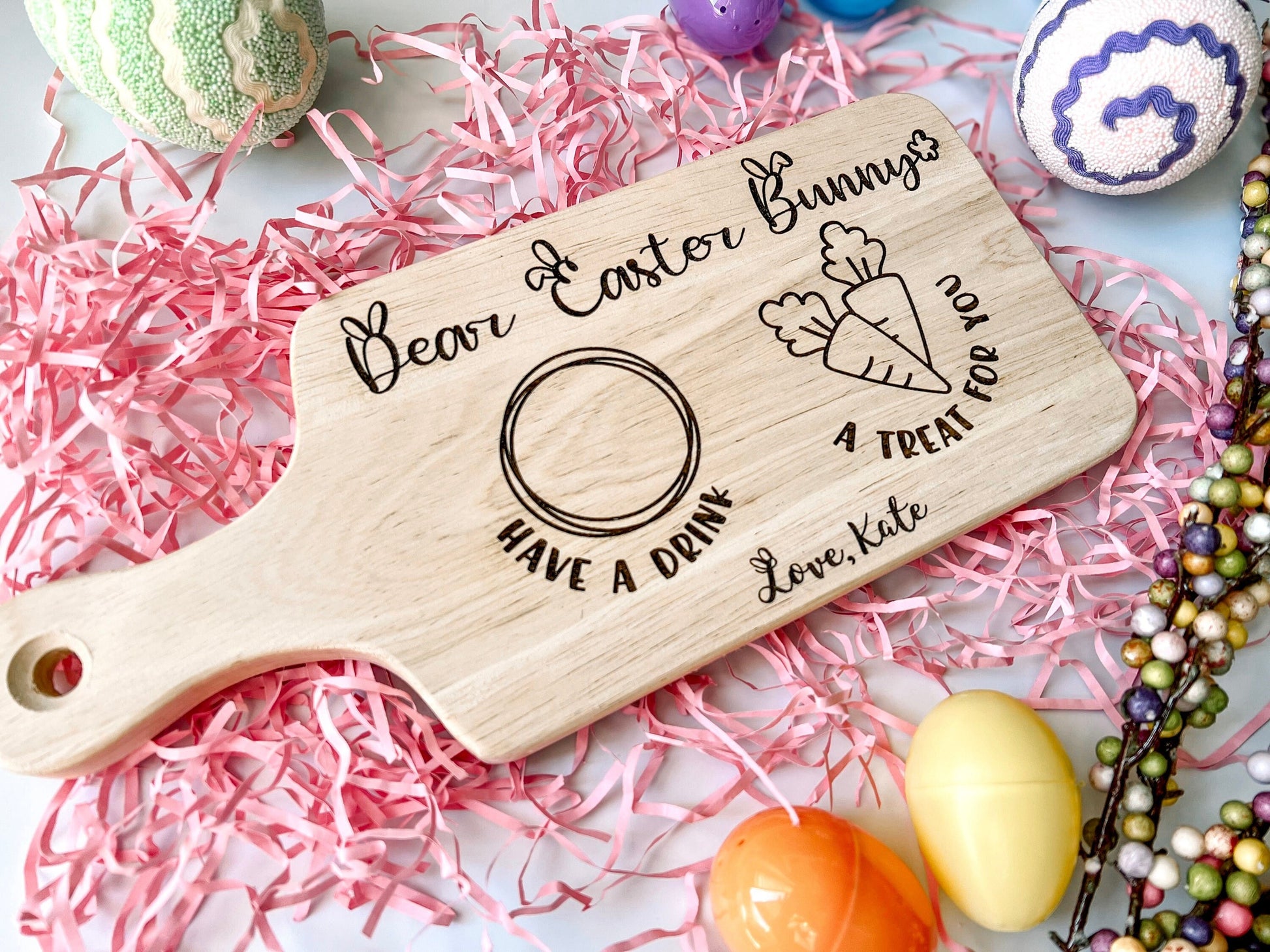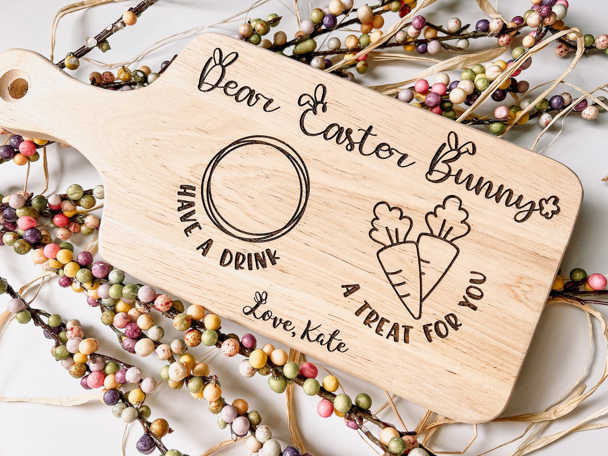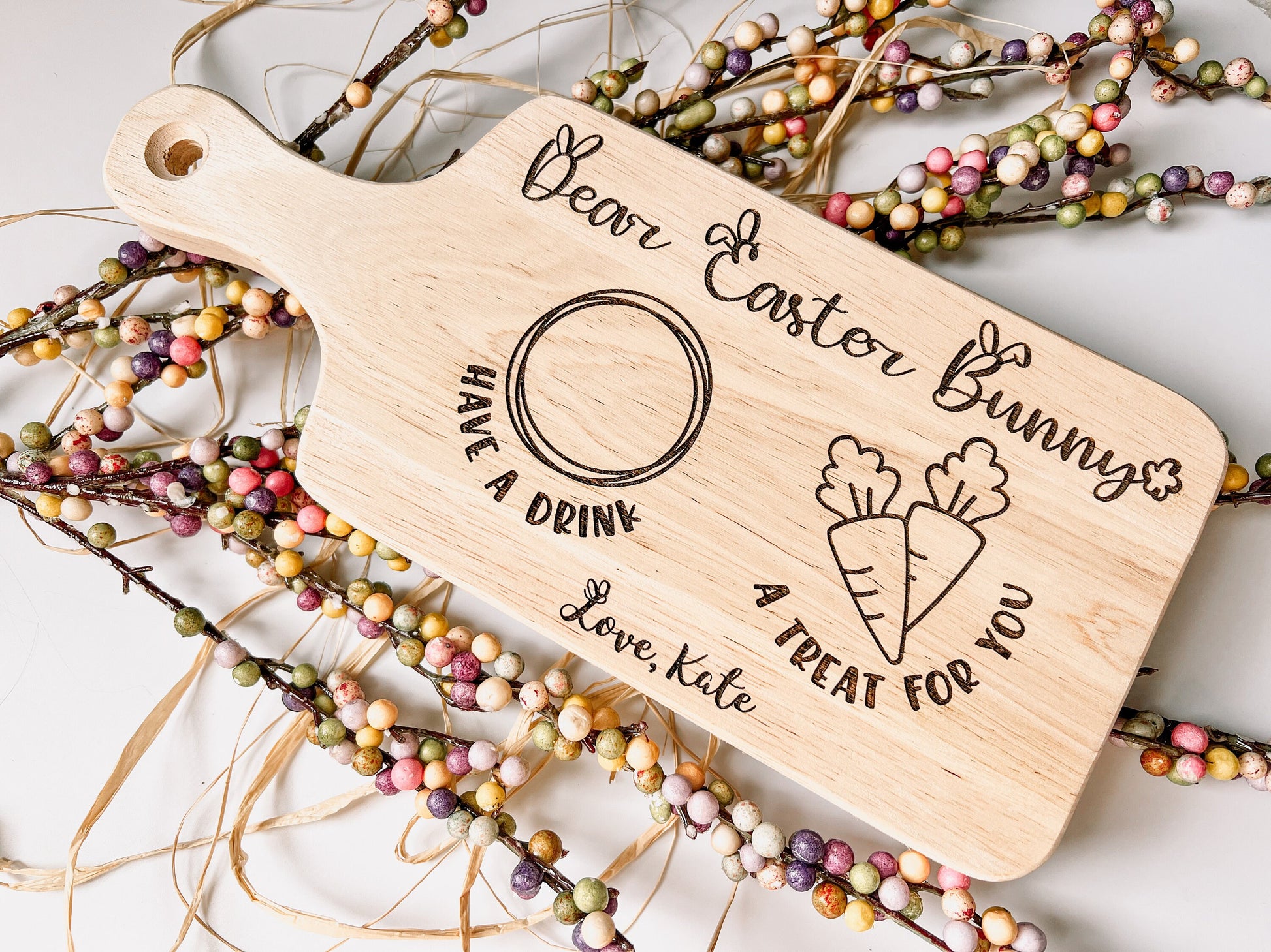 Leave treats out for Easter Bunny this year! This wooden board is the perfect addition to your Easter tradition and personalized with your kiddos name(s). Our Dear Easter Bunny tray is 13” x 5.5” and is ready to ship! Each board is laser engraved for ultimate use for years to come.