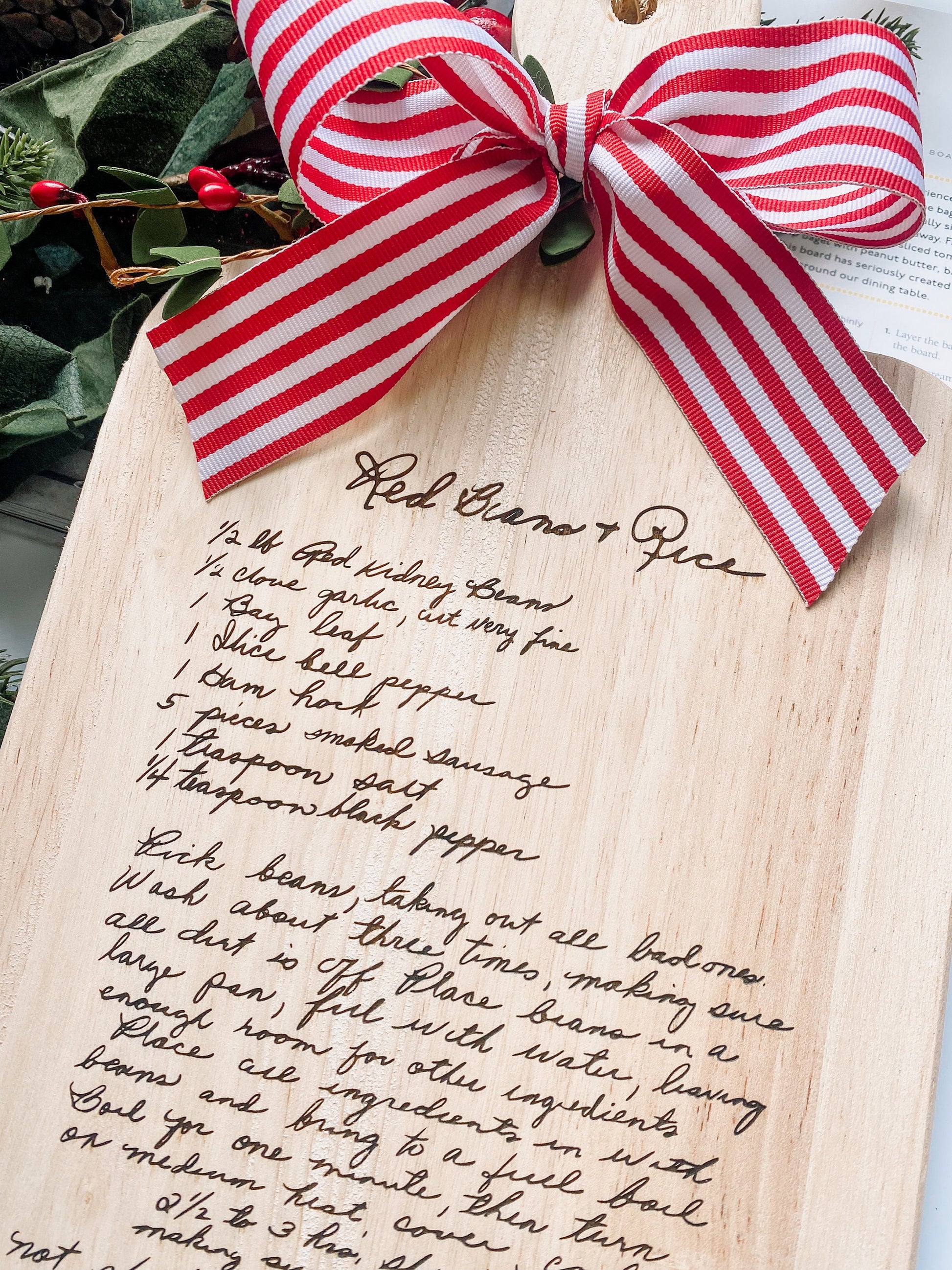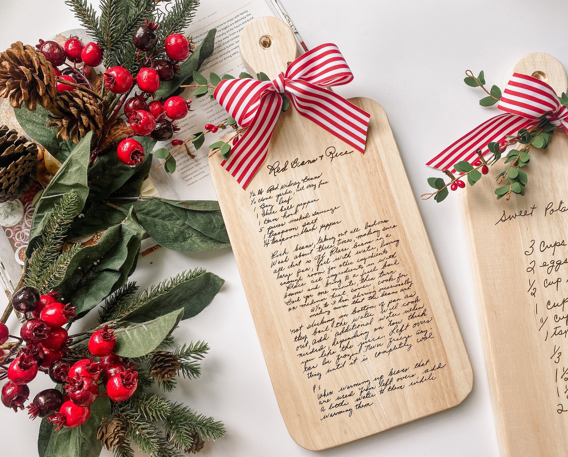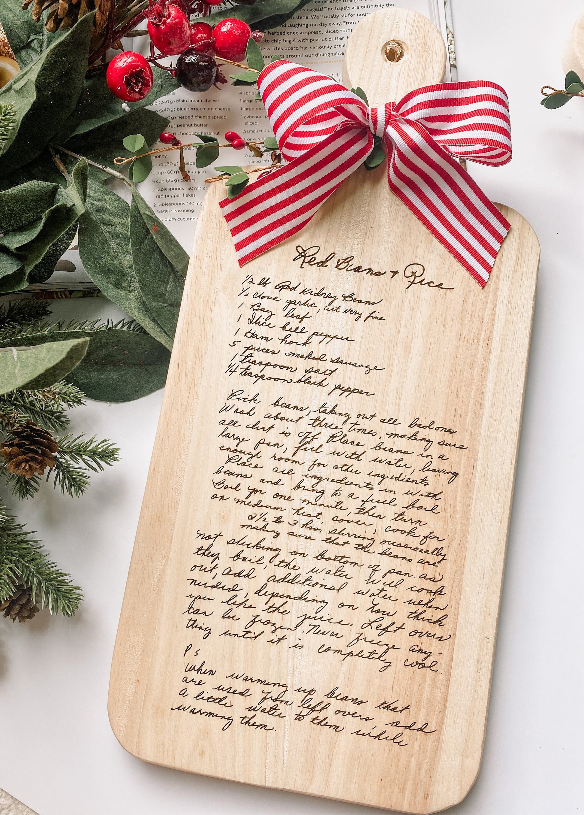 These cutting boards are absolutely the best way to preserve a family recipe that is close to your heart! We transfer your handwritten recipe onto these wooden cutting board by using our high quality laser. This piece is great to display and they make the best gifts!