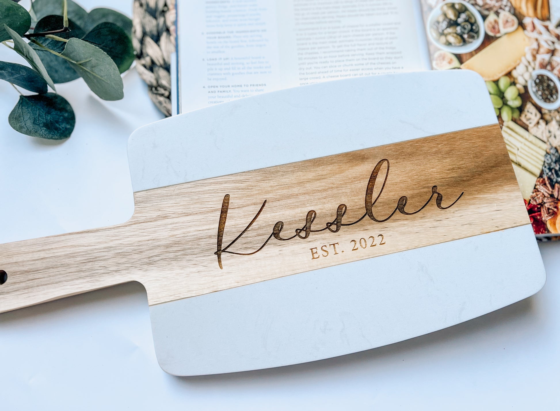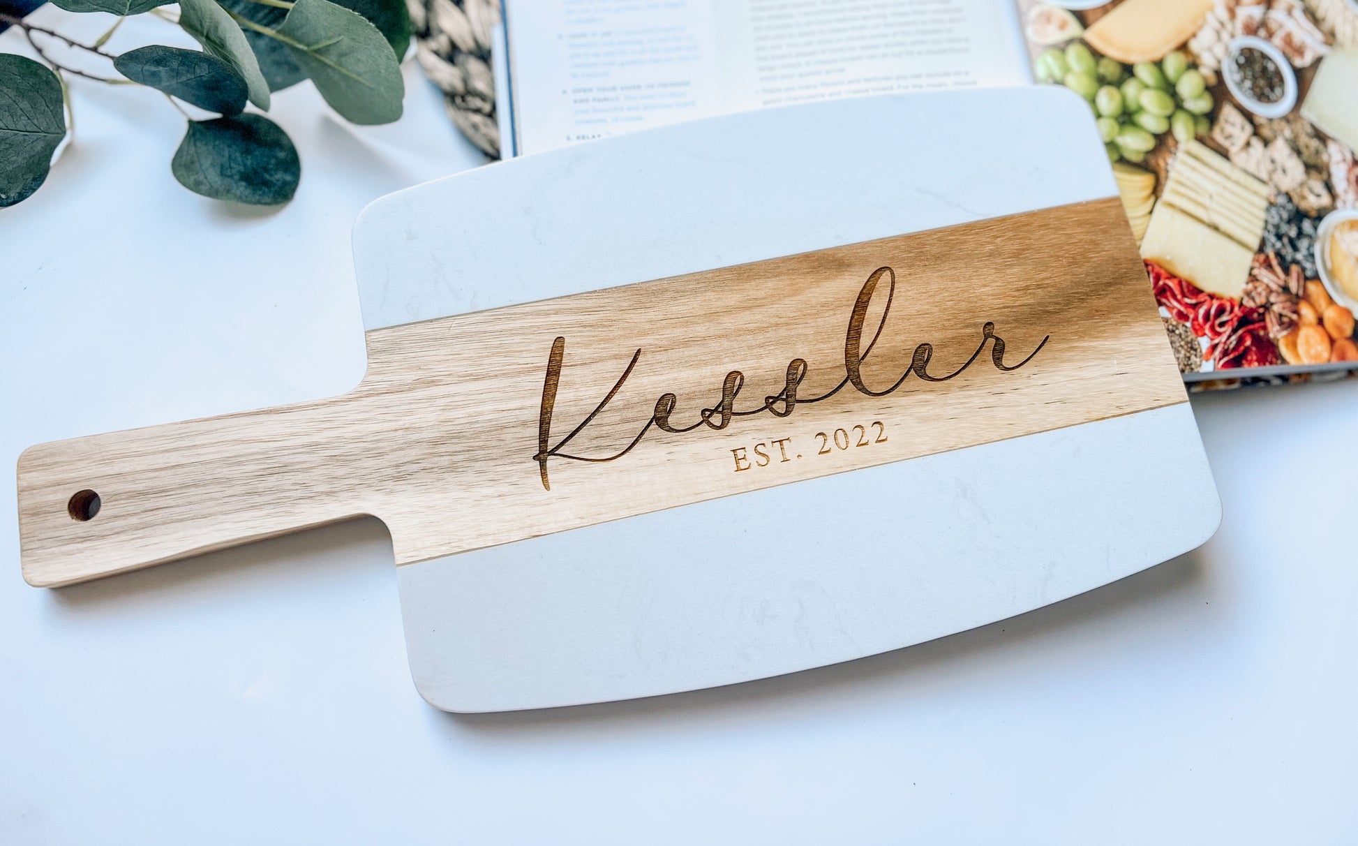 This custom engraved cutting board is perfect for any gift! Personalized with a last name, it is a gift that they will be sure to love! This board stands is 10 1/2" x 7 1/2" in size with a 4 1/2" handle. White Marble And Acacia Wood (Hand Wash Only)