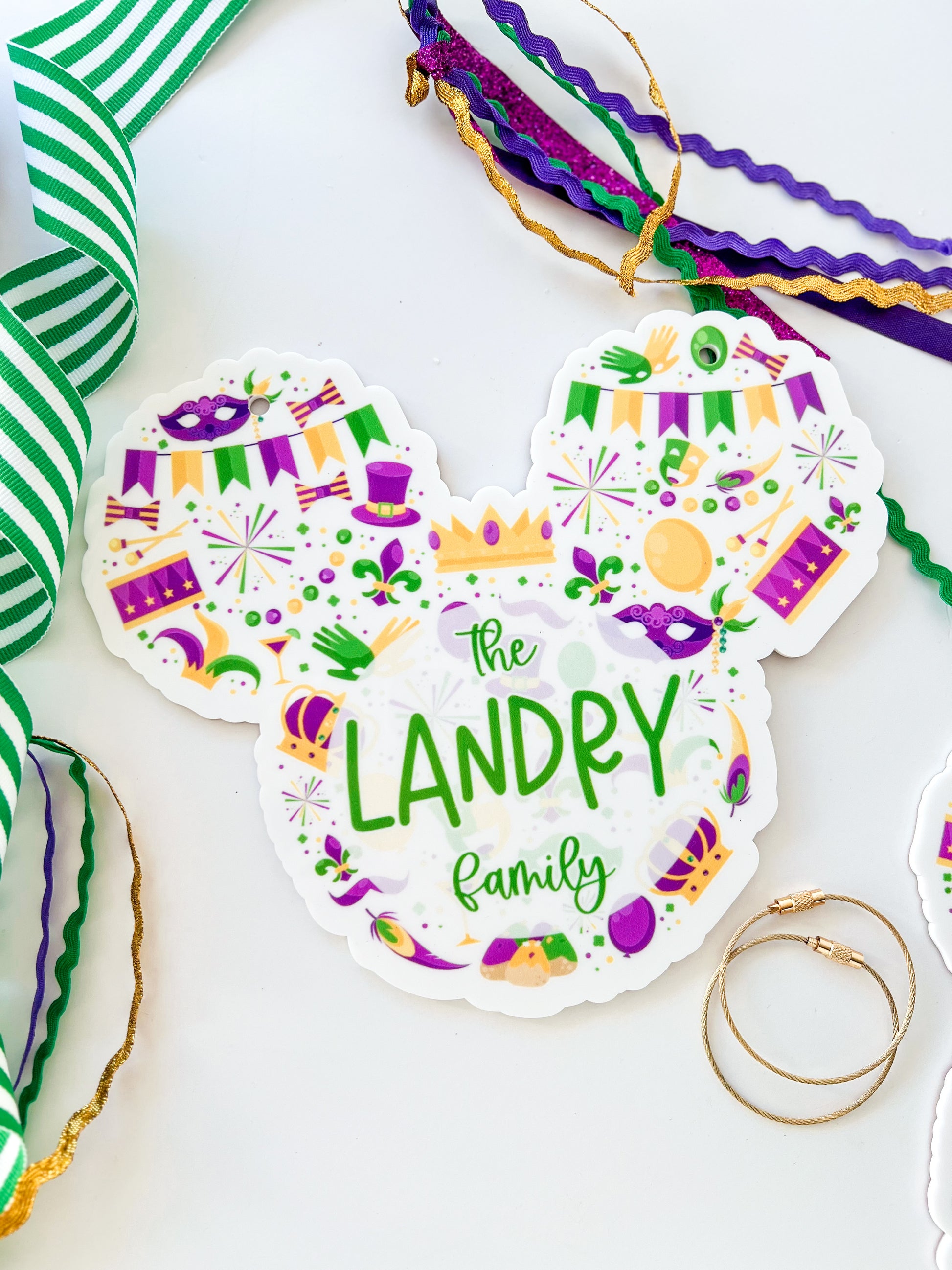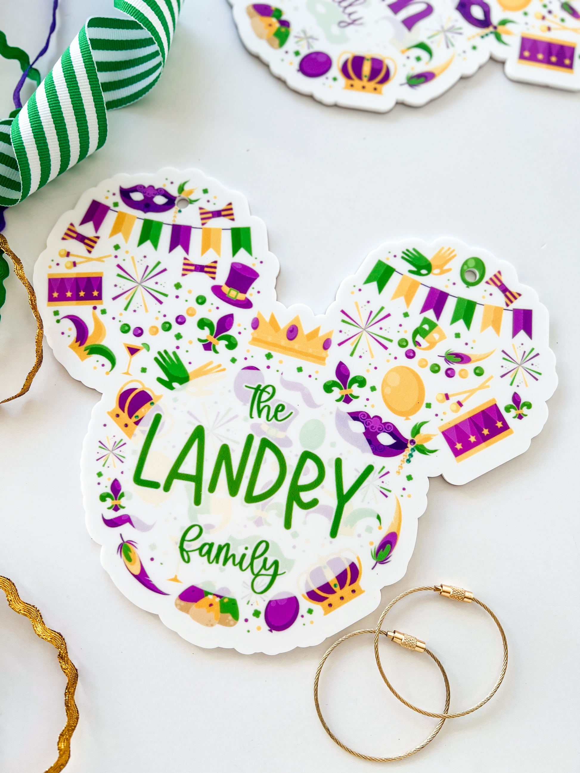 Heading to Disney for Mardi Gras? Did you know cast members often move strollers to keep things organized? These personalized stroller tags make it easy to identify your stroller in the crowd! UV-printed for vibrant, long-lasting color, each tag features your family’s name in a festive Mardi Gras design and comes with two durable gold wire attachments for secure fastening. Celebrate the season and stand out in style!